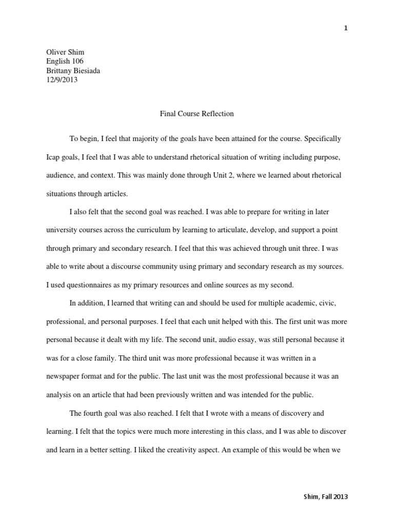 Course Reflection Sample 1. Then you can write about the course flow explain reasons you had for taking this course and tell readers what you learned from it. The best childhood experience date trip to Europe rock gig of a favorite band and some other topics are good.