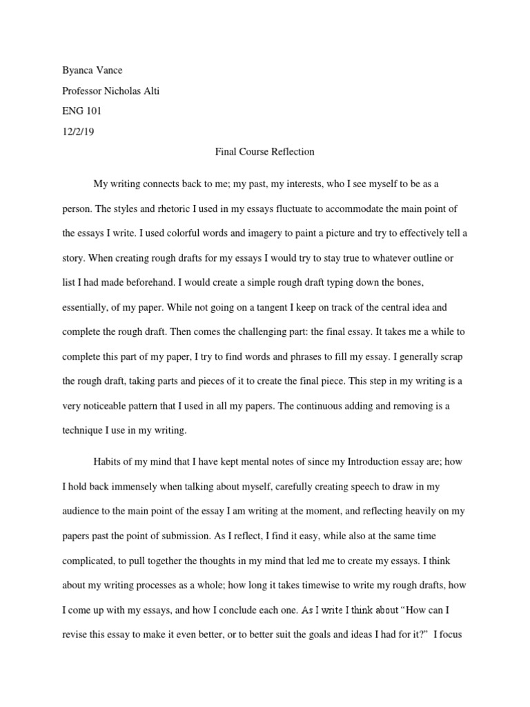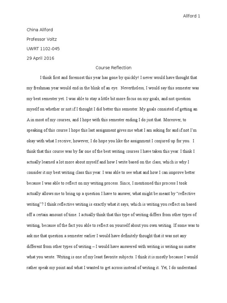 I believe the class was able to let me see all of this in a manner that was wider than before and definitely better informed than before. Course A good place to start is to include the course name and its description. Use of 1-inch border margin at the sides top and bottom of page Page size should be white with size of 8 ½ by 11 Most of the times instructors ask for double spaced paragraphing A reflective essay like all essays should include an introduction a body and the conclusion.